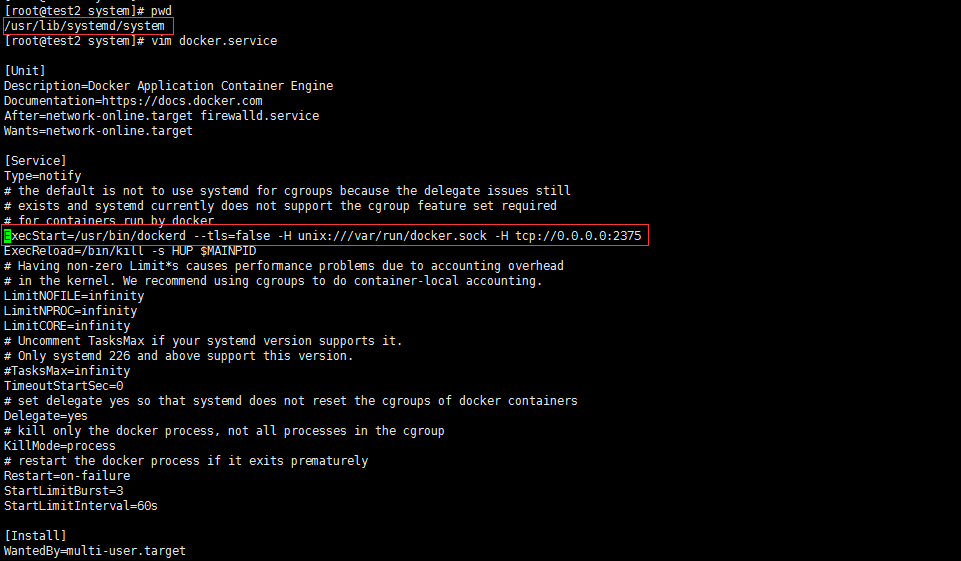 ExecStart=/usr/bin/docker --tls=false -H unix:///var/run/docker.sock -H tcp://0.0.0.0:2375