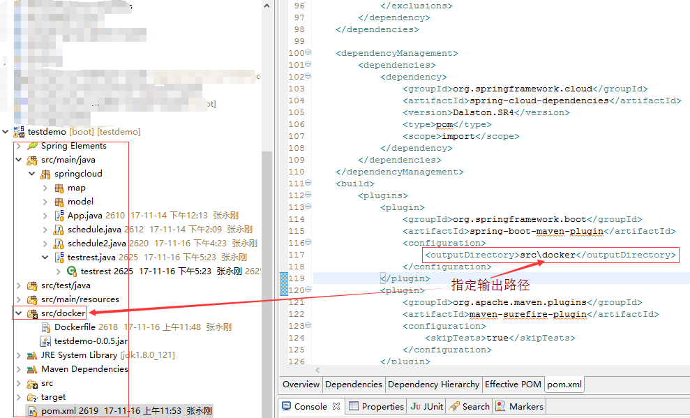 上面的路径是java工程的路径Dockerfile文件在上面的路径在工程中写好另外我们工程生成的java包也是需要生成输出到这个目录的