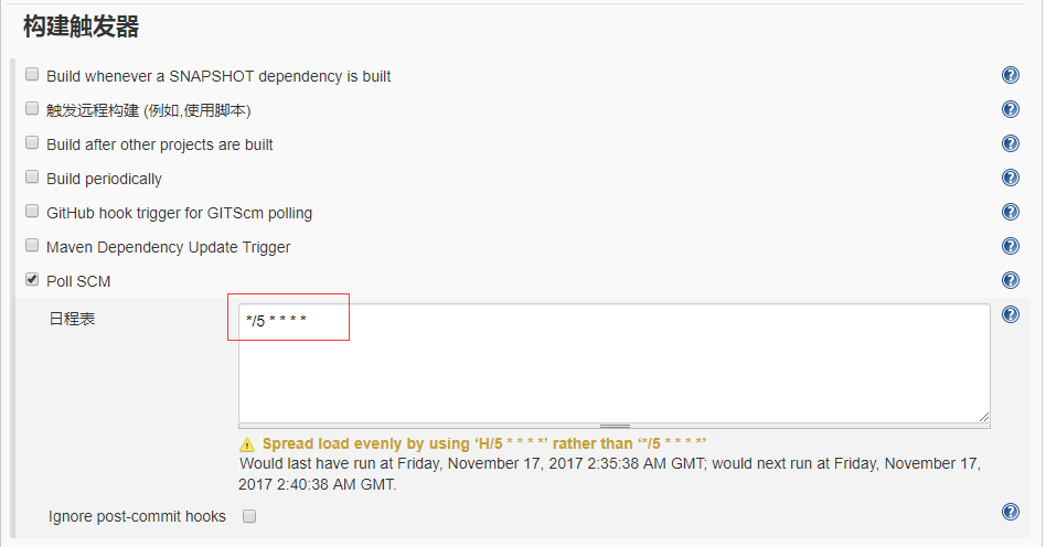 每5分钟构建一次这样就可以 我们编辑完代码 上传svn就会马上发布到测试版