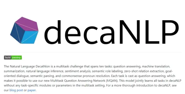 decaNLP:自然语言处理领域的多任务挑战,涵盖10个任务:回答问题、机器翻译、文本综述、自然语言推理、语义分析、语义标注、零样本关系提取、面向目标的对话、语义解析和常识名词解析。[GitHub上948个star]