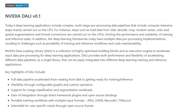 DALI:包含已经高度优化过的搭建模块以及一个用于深度学习应用中数据预处理的执行引擎。[GitHub上450个star]