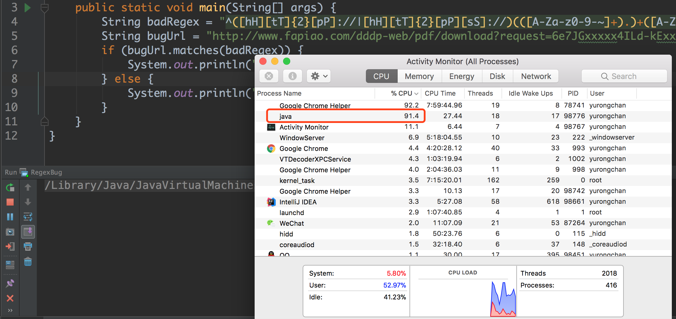 看到这里,我们基本可以推断,这个正则表达式就是导致 CPU 利用率居高不下的凶手!