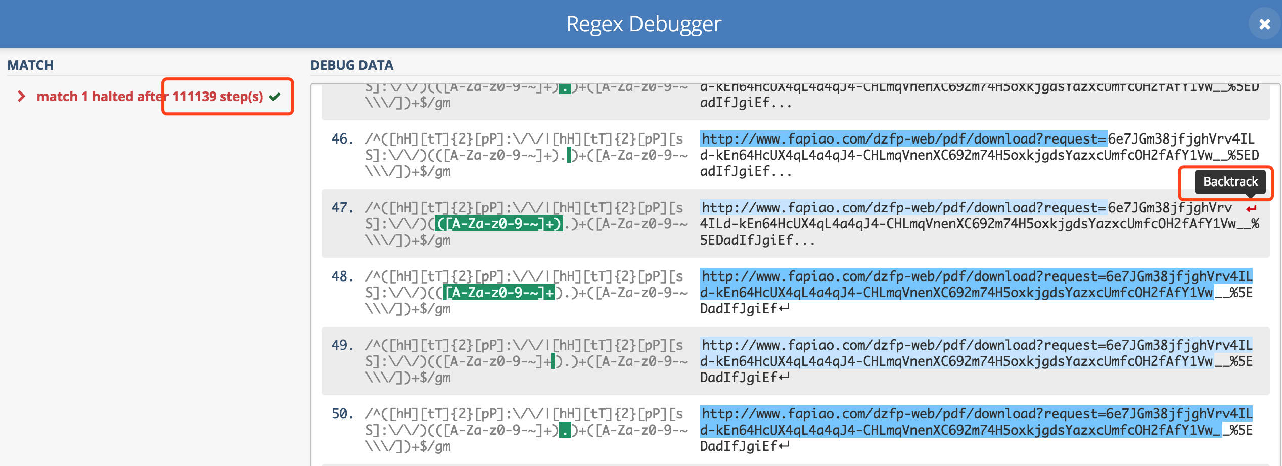 com/dzfp-web/pdf/download?request=6e7JGm38jf.....,你会发现因为贪婪匹配的原因,所以程序会一直读后面的字符串进行匹配,最后发现没有点号,于是就一个个字符回溯回去了。