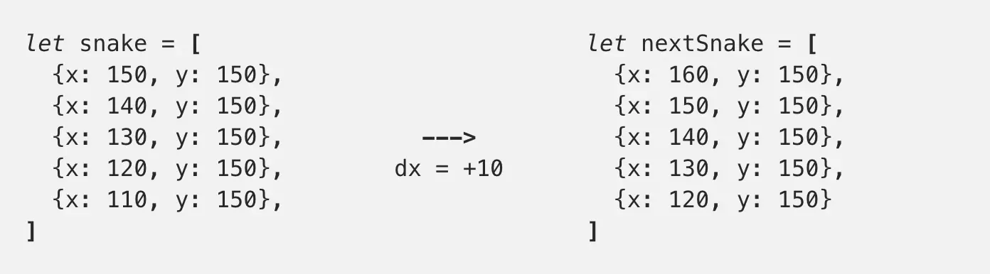 嗯,为了让蛇能够一步一步(10 px)移动到最右边,我们可以把蛇的每个部位的 x 坐标,每次增加 10 px(dx = +10 px)。同理,为了让蛇移动到最左边,每次把蛇的每个部位的 x 坐标减少 10 px(dx = -10)。