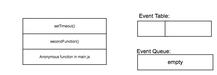 第一、二、是和同步一样的,将secondFunction()放入到了call stack中,然后执行,此时需要执行一个异步方法,在setTimeout执行之前是如下情况: