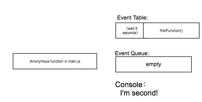 主线程继续执行secondFunction(),控制台输出I'm second!,secondFunction()推出call stack, 此时5s还未到:
