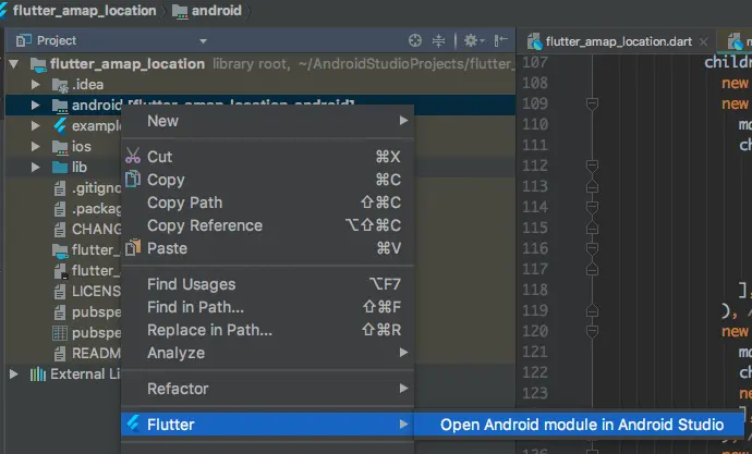 在AS中项目视图中选择android,点右键->Flutter->Open Android module in android studio。