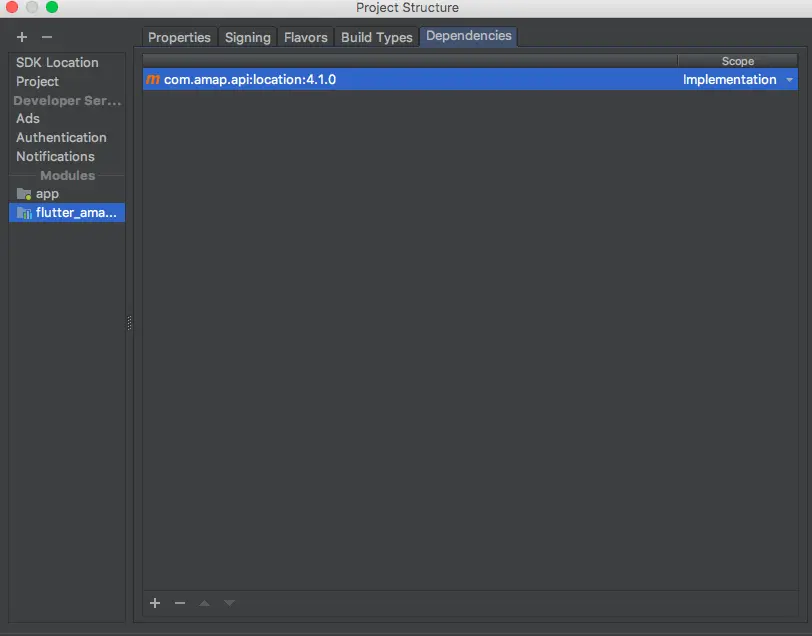 打开android模块后,点File->Project Structure, 左侧栏选择modules->flutter_amap_location,右边dependencies页。