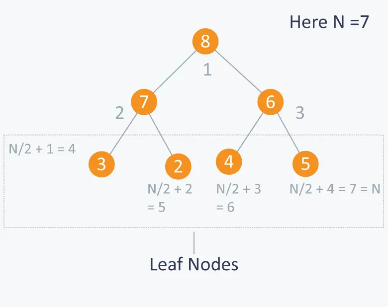 构建最大堆,首先明确一个规则,堆的叶子节点的位置,假设堆的数量为N=7; 那么它的叶子节点就是 N/2+1,N/2+2,N/2+3,N/2+4,如图所示: