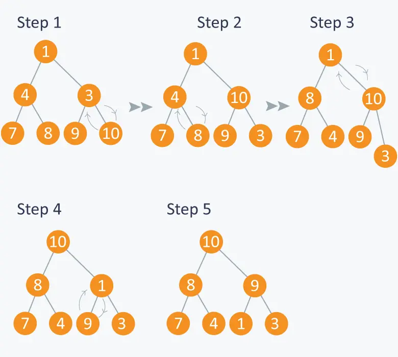 max_heapify就是递归的将父节点和左右子节点进行大小比较,将较大的值放到父节点的位置。下图演示了一个构建最大堆的过程