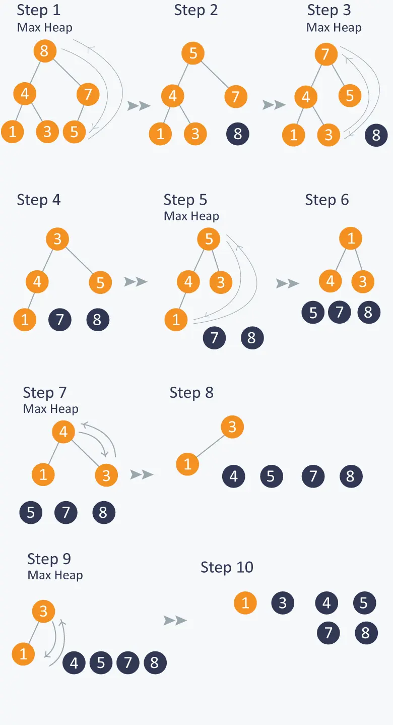 说到应用了,如果给定了一个无序的数组按照从小到大排序,那么我们就可以利用最大堆的性质在O(NlogN)的时间复杂度内进行排序。 堆排序一般按照如下步骤: 1.构建最大堆。 2.交换第一个元素和最后一个元素的位置。 3.从根节点开始,进行堆最大化操作(max_heapfy),注意此时待排序节点的个数为N-1,因为第二步的时候已经排序好一个值了。 4.重复2,3步骤直到排序完成。 如果是从大到小排序,那么就用最小堆。 排序过程入下图: