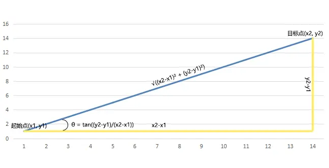 设起点坐标为x0, y0, 终点坐标为x1, y1 ,即可得 distance = √(x1-x0)² + (y1-y0)²,用代码表示则是Math.sqrt(Math.pow((x1-x0), 2) + Math.pow((y1-y0), 2))