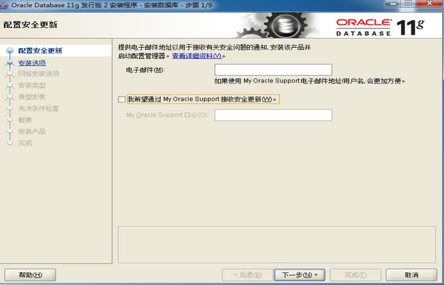 3、在出现的“配置安全更新”窗口中,取消“我希望通过My Oracle Support接受安全更新”,单击“下一步”: