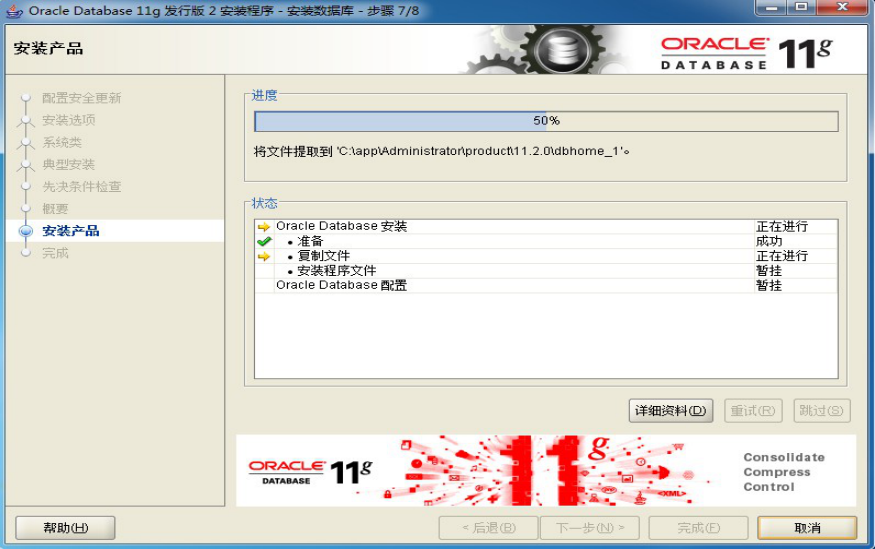 数据库配置文件已经安装到 C:\app\Administrator,同时其他选定的安装组件也已经安装到 C:\app\Administrator\product\11.2.0\dbhome_1。
