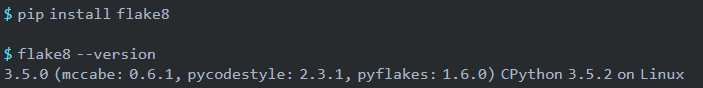 $ pip install pylint$ pylint --versionpylint 2.0.0astroid 2.0.1Python 3.5.2 (default, Nov 23 2017, 16:37:01)[GCC 5.4.0 20160609]