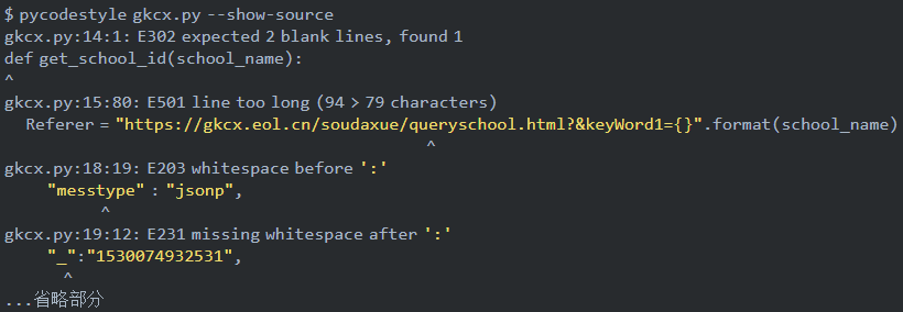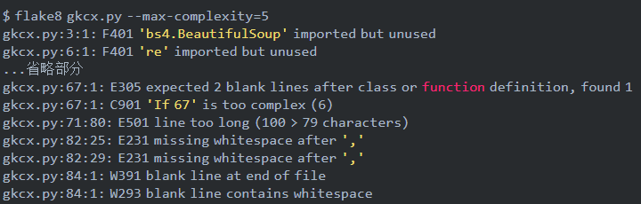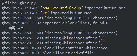 PyFlakes 和 Pep8 的输出将合并起来一起返回。可以看出 flake8 不止检查代码错误,还会对代码规范不对的地方进行检查,比如:一行代码过长。