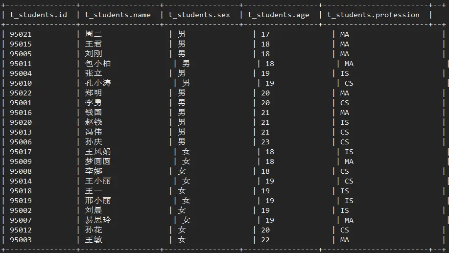 as select id,name,tel,age from sopdm.wyp where age=25;