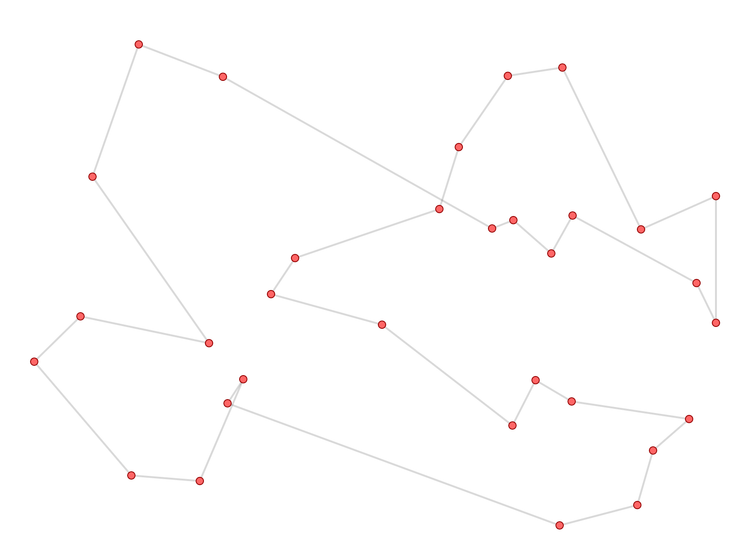 首先随机生成 N 个城市,这儿我们取 N = 50,每个城市包含 x、y 两个坐标。将它们用红圈在画布上画出来,再随机生成一条路线,图片看起来类似下图: