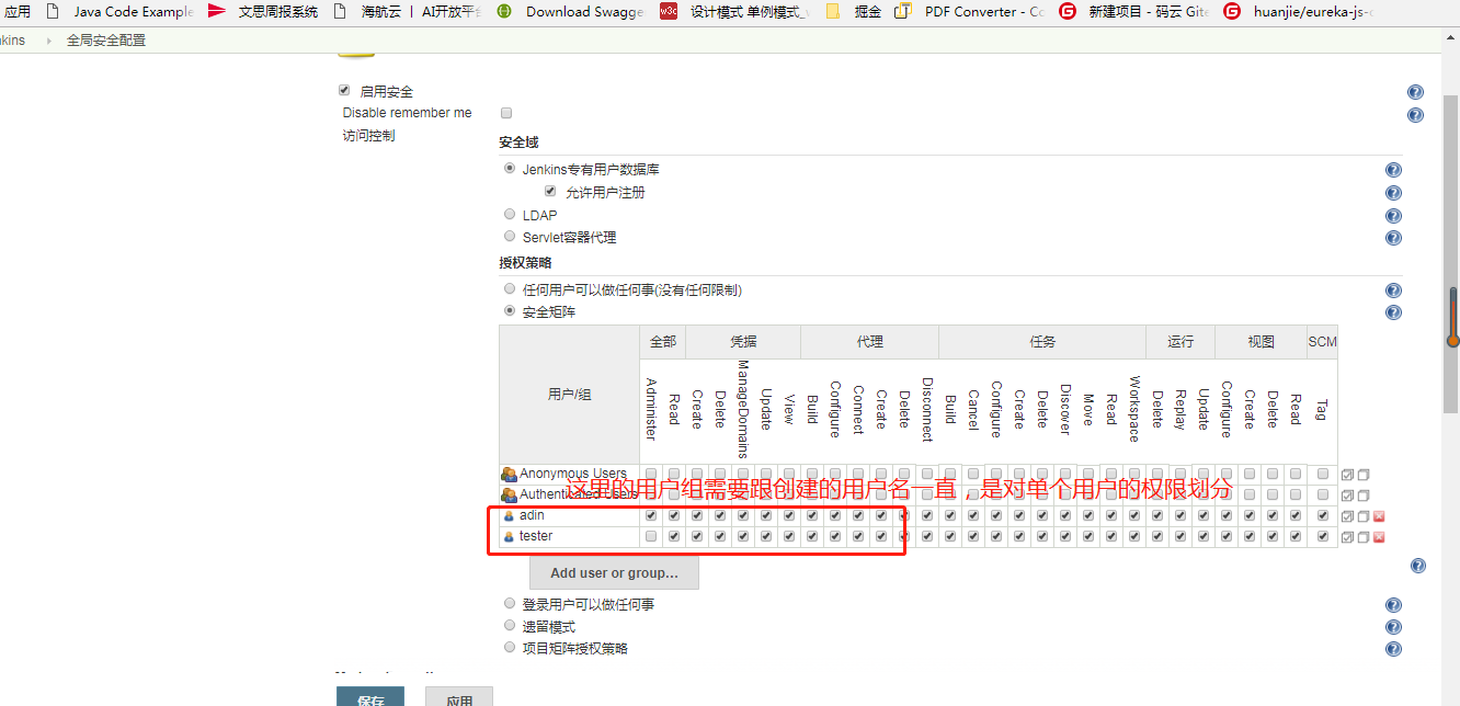Jenkins基础设置 注册admin 用户,在全局系统设置中 ,设置用户权限矩阵,实现管理jenkins用户 与使用jenkins用户的职责划分