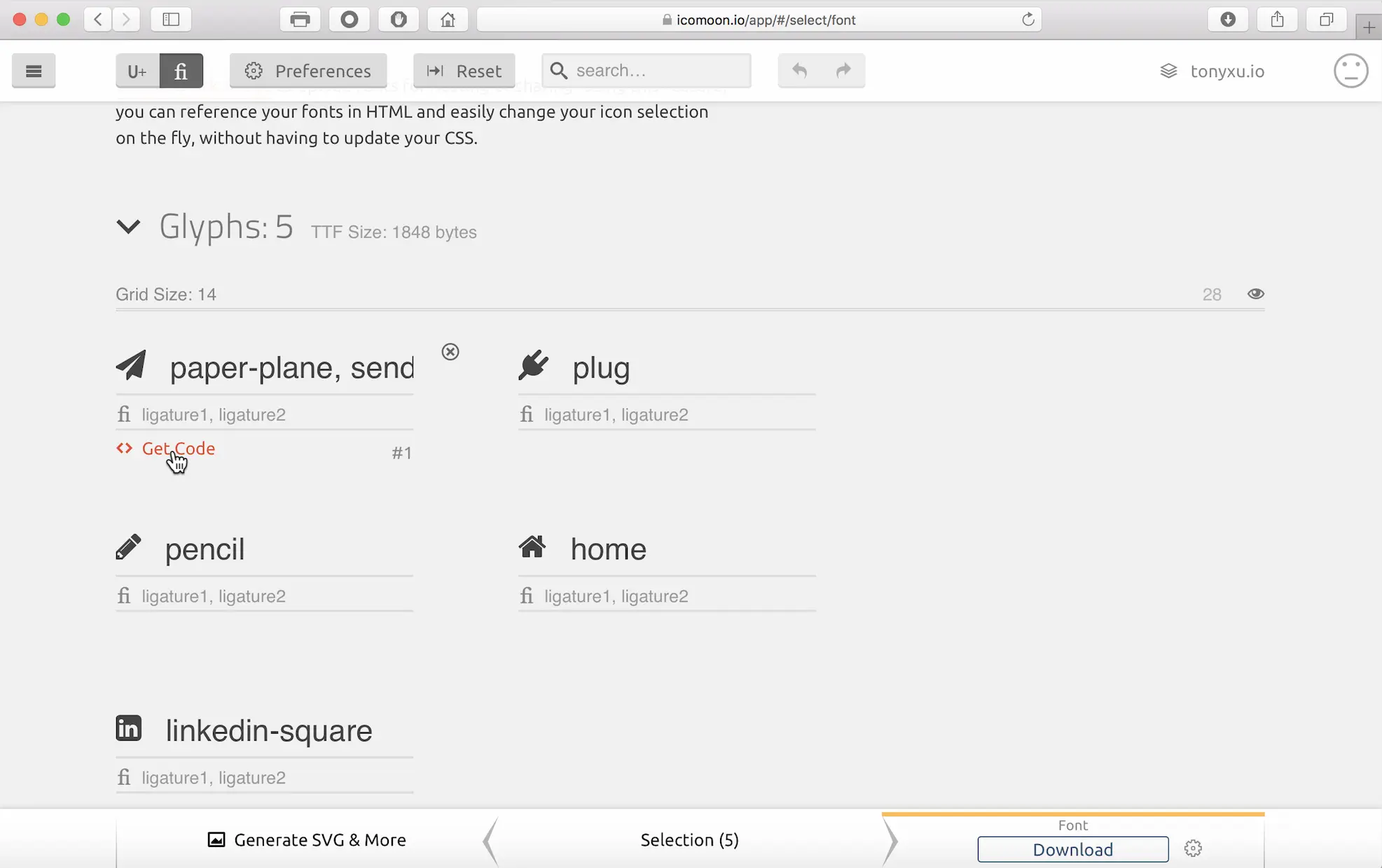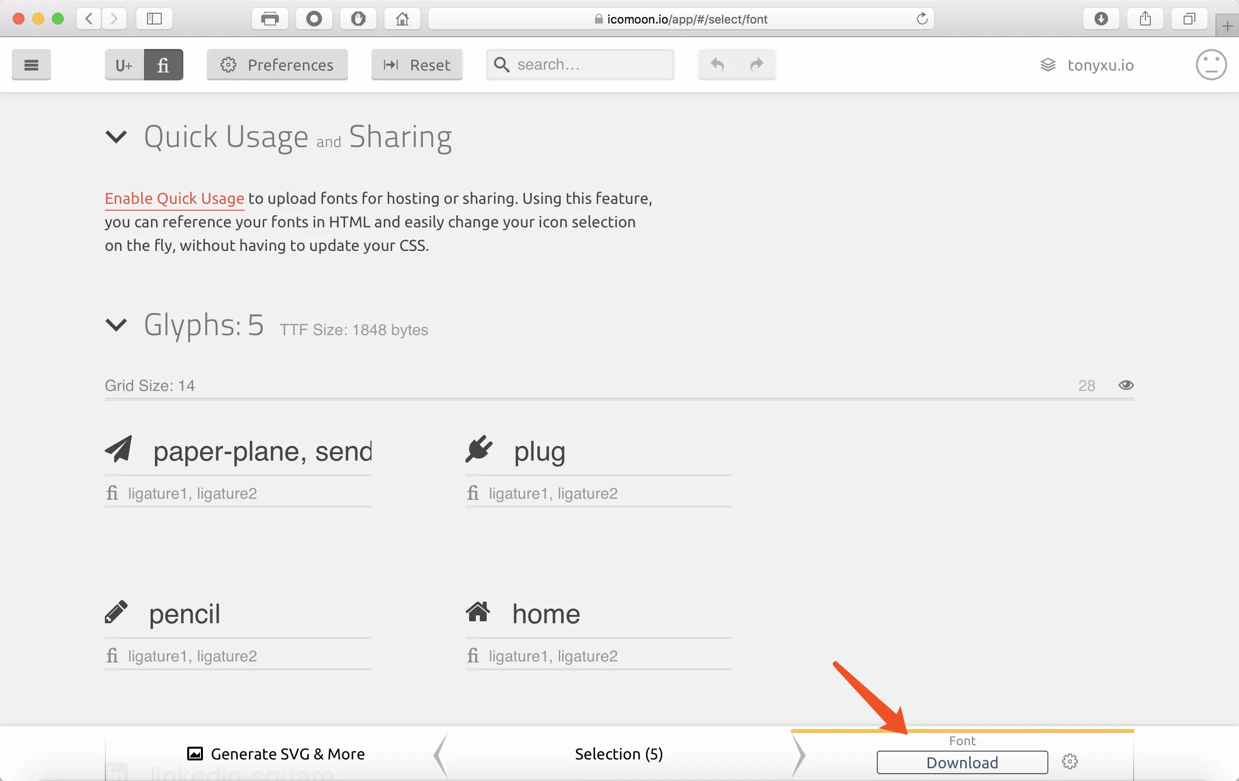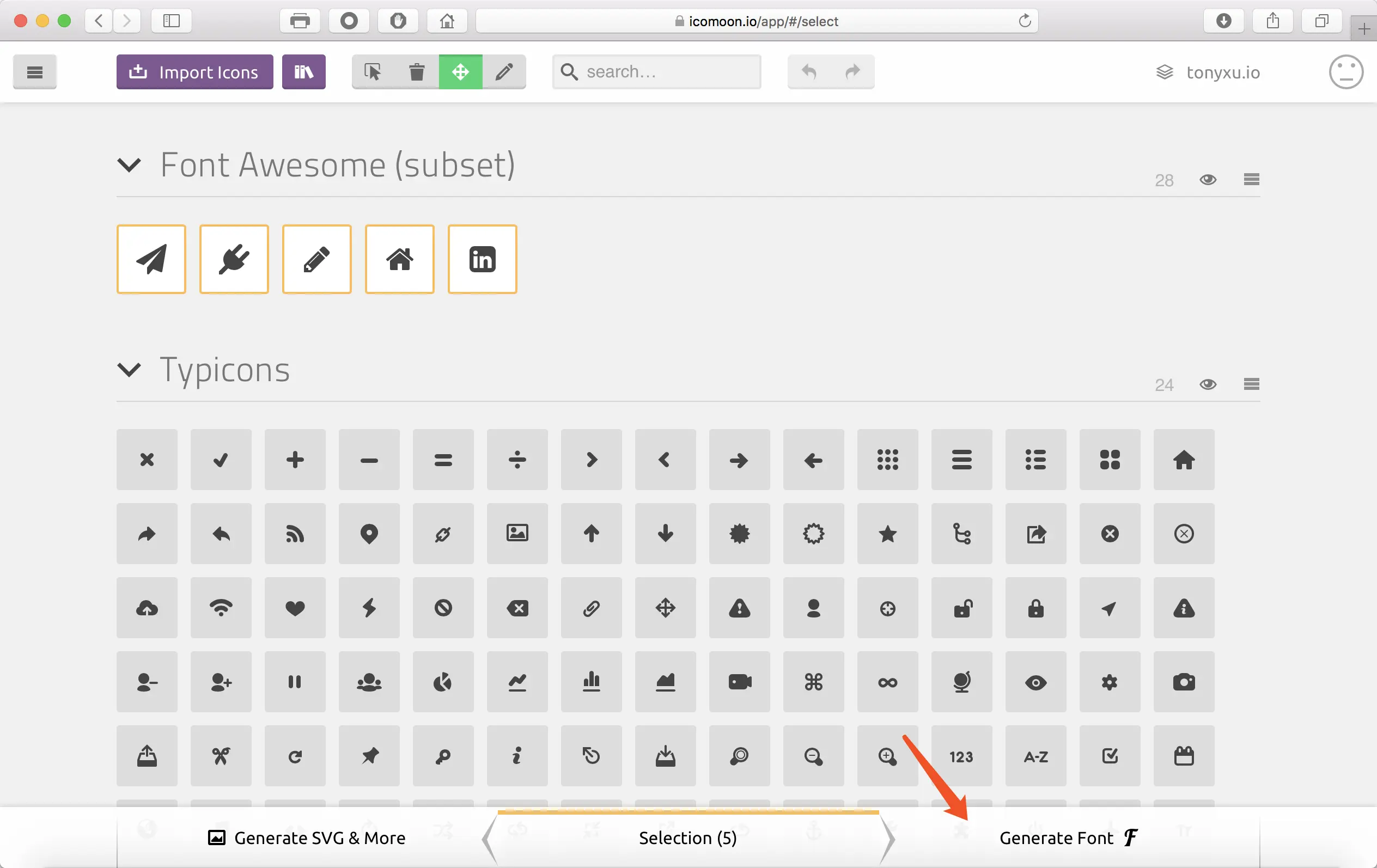 访问IcoMoon主页选择所有你需要使用的图标并点击生成字体(Generate Font)
