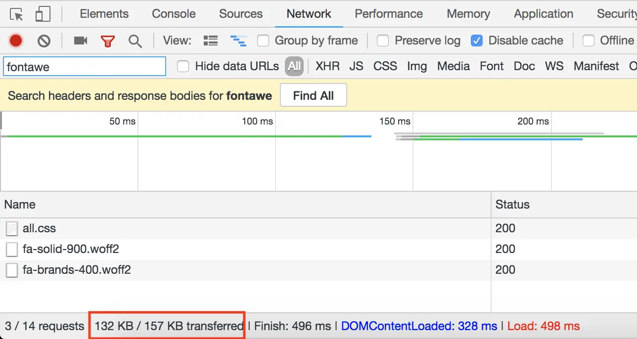 图标字体相关体积减少比例: (132 - 2.4) / 132 = 0.98%, 总资源也从157KB下降到了38.7KB,效果非常之明显!