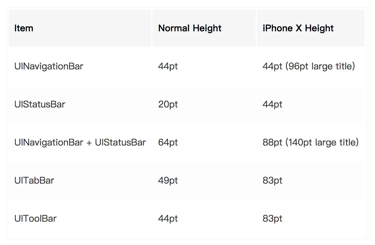 根据苹果官方的文档,iPhone X 顶部状态栏的适配安全区域的高度为 44pt,底部操作条区域的高度为 34pt。另外,在 iPhone X 中,一些系统 Bar 的默认高度相比于之前的设备也发生了变化,如下表所示。