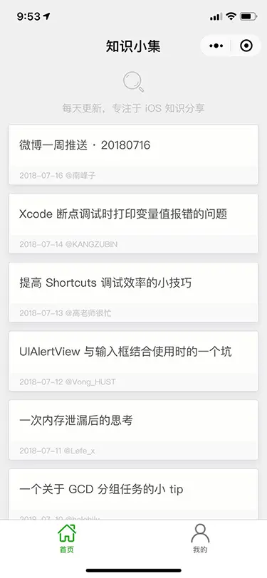 如果我们使用微信小程序官方组件进行开发,没有进行自定义,在 app.json 文件中设置 tabBar 页面,且 window 的 navigationStyle 值为 default,那么我们无需在 iPhone X 中对导航栏和标签栏进行适配,微信会自动帮我们适配好,如下图为知识小集小程序的首页: