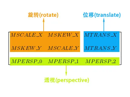 从上图可以看到最后三个参数是控制透视的,这三个参数主要在3D效果中运用,通常为(0, 0, 1),不在本篇讨论范围内,暂不过多叙述,会在之后对文章中详述其作用。