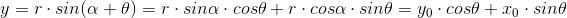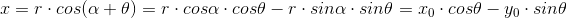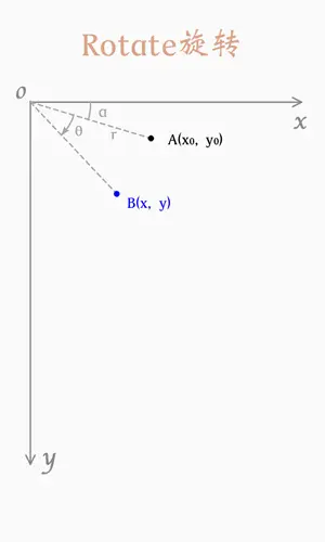 假定一个点 A(x0, y0) ,距离原点距离为 r, 与水平轴夹角为 α 度, 绕原点旋转 θ 度, 旋转后为点 B(x, y) 如下:
