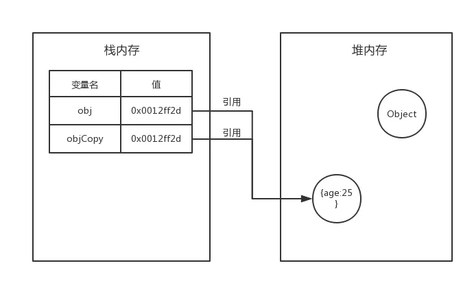 如果所示,执行了var objCopy=obj之后,obj和objCopy具有相同的地址值,执行堆内存中的同一个实际对象。