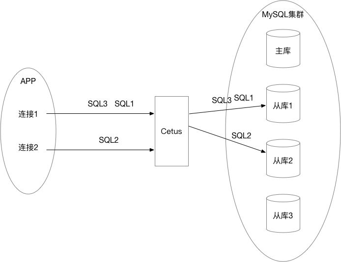 在流量分配方面,Cetus也进行了优化。一些MySQL数据库中间件(例如Atlas)是基于SQL的维度做负载均衡的,不会考虑SQL是同一个连接还是不同连接发送来的,中间件依次将接收到的SQL按照策略发往后端的数据库。