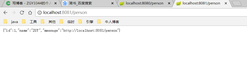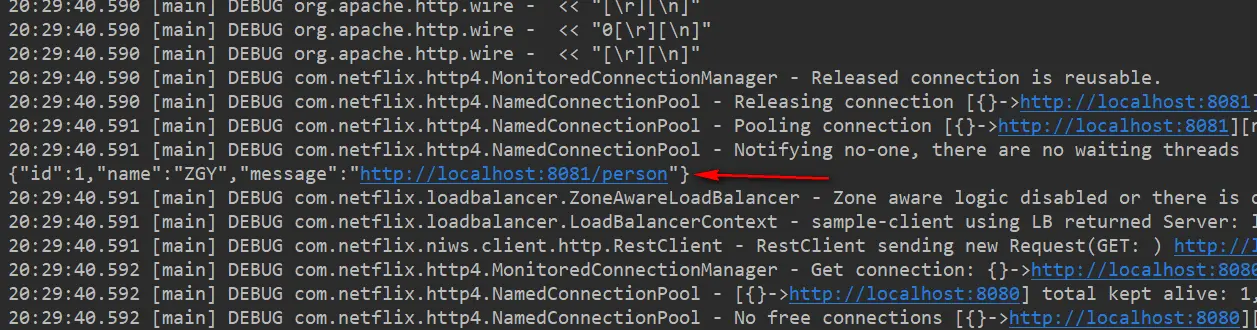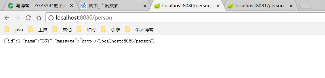 在控制台,我们输出的信息,message属性的端口号是轮询的,8080和8081之间切换的