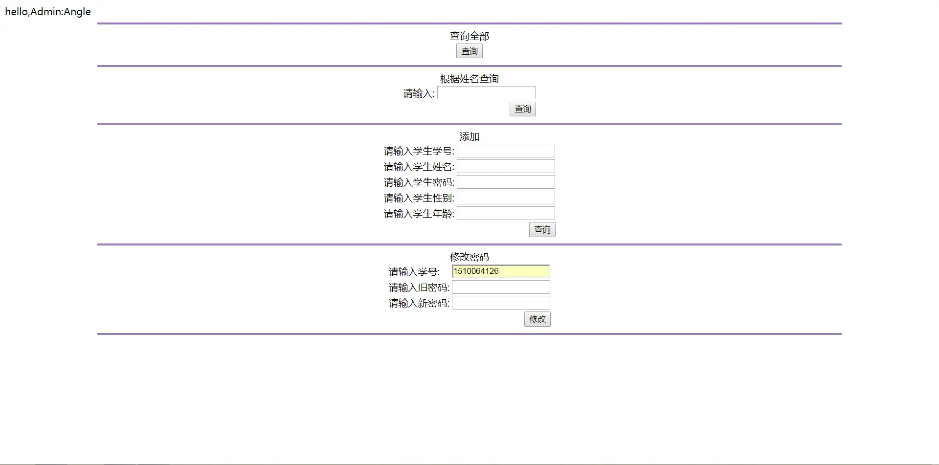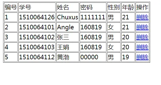 <td>编号</td><td>学号</td><td>姓名</td><td>密码</td><td>性别</td><td>年龄</td><td>操作</td>