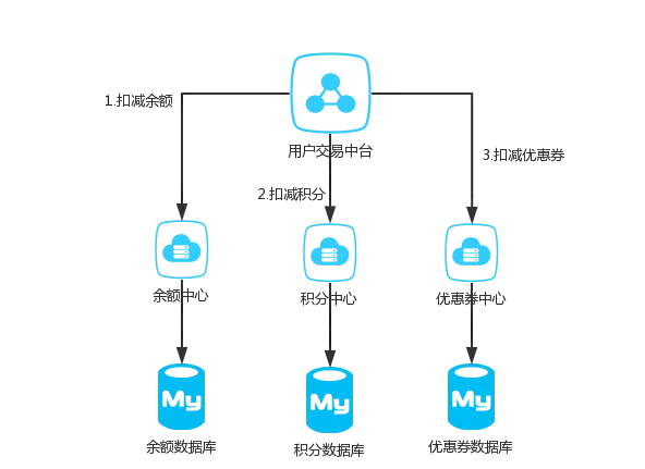 T1=扣100元 T2=给用户加一瓶水 T3=减库存一瓶水