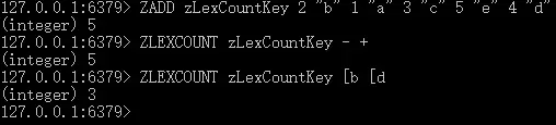 ZADD zLexCountKey 2 "b" 1 "a" 3 "c" 5 "e" 4 "d"