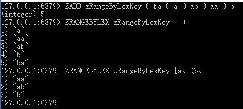 ZADD zRangeByScoreKey 1 ba 2 a 3 ab 4 aa 5 b