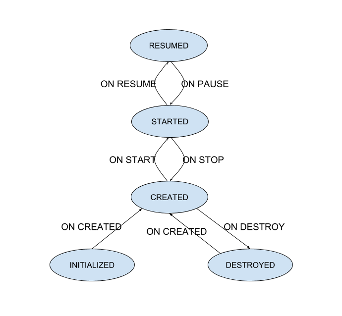 1public class LifecycleRegistry extends Lifecycle { 2 3 static State getStateAfter(Event event) { 4 switch (event) { 5 case ON_CREATE: 6 case ON_STOP: 7 return CREATED; 8 case ON_START: 9 case ON_PAUSE:10 return STARTED;11 case ON_RESUME:12 return RESUMED;13 case ON_DESTROY:14 return DESTROYED;15 case ON_ANY:16 break;17 }18 throw new IllegalArgumentException("Unexpected event value " + event);19 }2021 private static Event downEvent(State state) {22 switch (state) {23 case INITIALIZED:24 throw new IllegalArgumentException();25 case CREATED:26 return ON_DESTROY;27 case STARTED:28 return ON_STOP;29 case RESUMED:30 return ON_PAUSE;31 case DESTROYED:32 throw new IllegalArgumentException();33 }34 throw new IllegalArgumentException("Unexpected state value " + state);35 }3637 private static Event upEvent(State state) {38 switch (state) {39 case INITIALIZED:40 case DESTROYED:41 return ON_CREATE;42 case CREATED:43 return ON_START;44 case STARTED:45 return ON_RESUME;46 case RESUMED:47 throw new IllegalArgumentException();48 }49 throw new IllegalArgumentException("Unexpected state value " + state);50 }51}