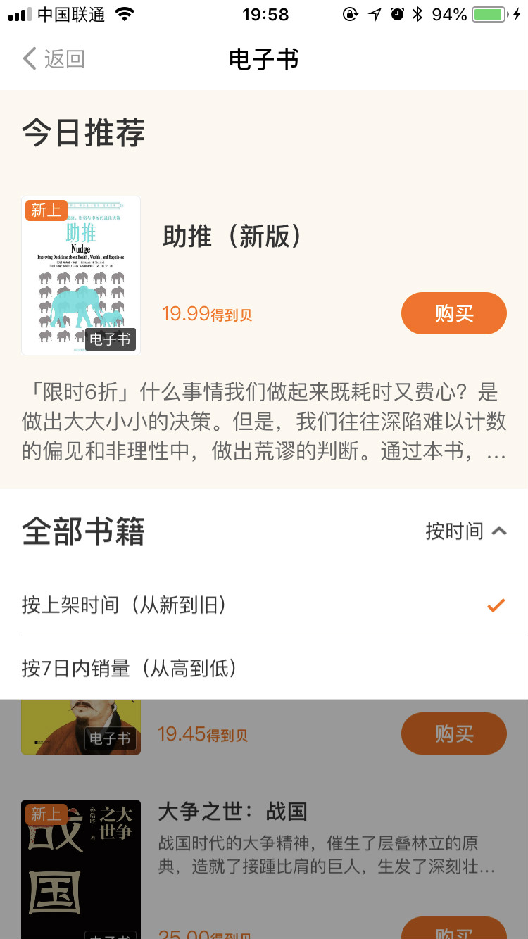 电子书:有推荐和全部书籍,没有详细分类可供选择,可见电子书不是得到的主要卖点。