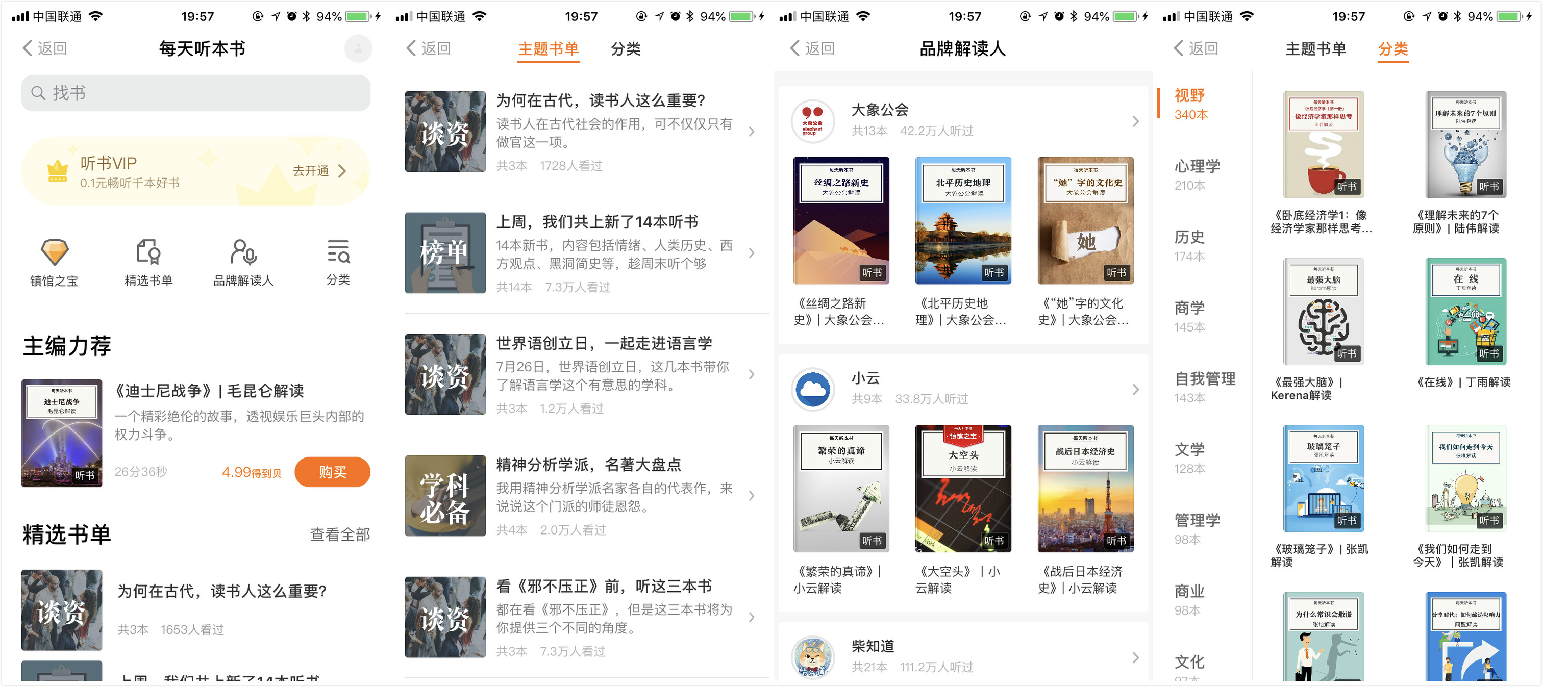 听书:内容丰富,有镇馆之宝、精选书单、品牌解读人等三个页面引导用户快速选择出适合自己的知识内容,也可从【分类】中根据类目找到自己感兴趣的内容。购买VIP则听书中所有内容都可以借阅。