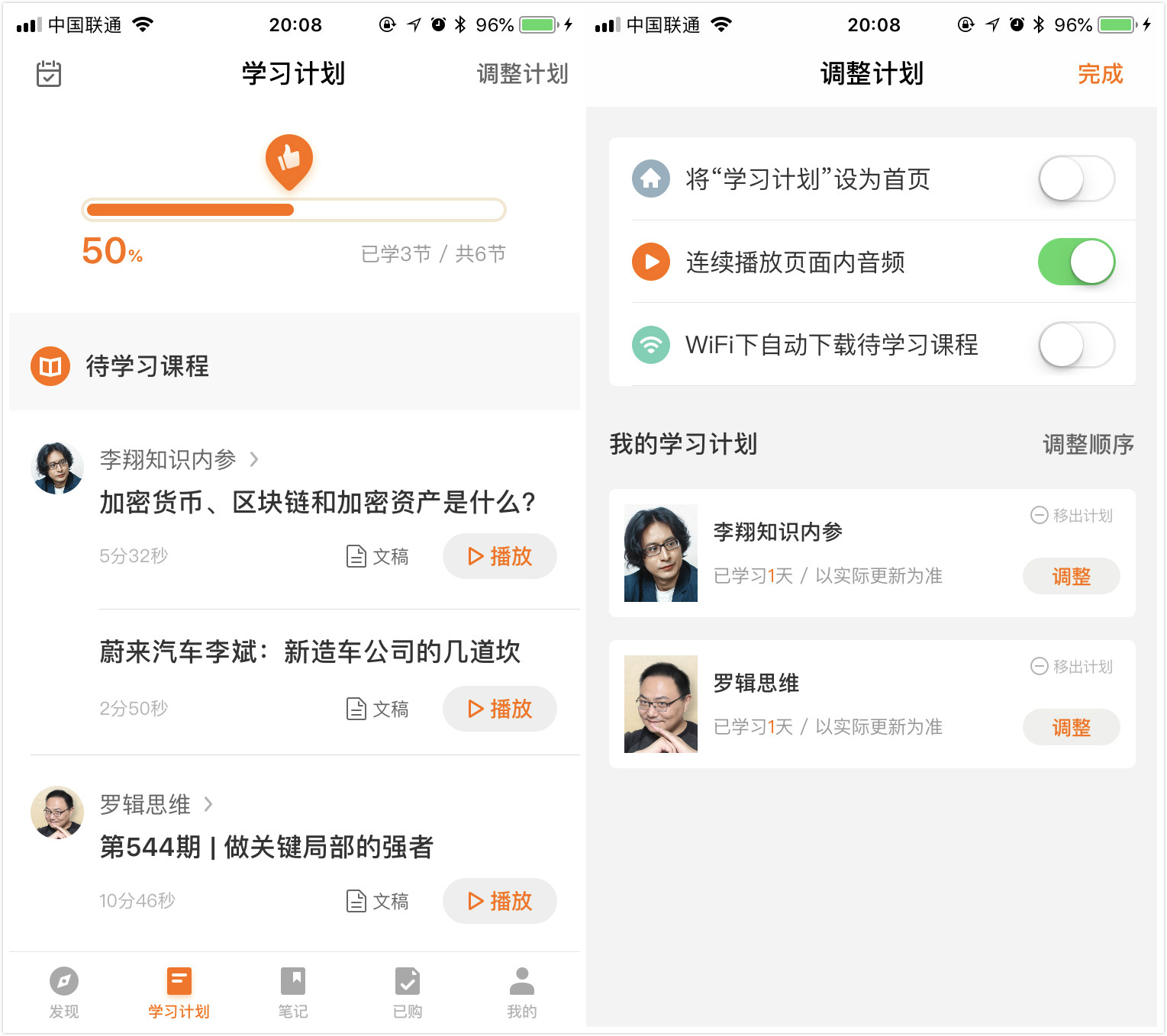 学习计划:可将已经拥有的内容编排在学习计划中,几个主题换着听可以避免乏味。