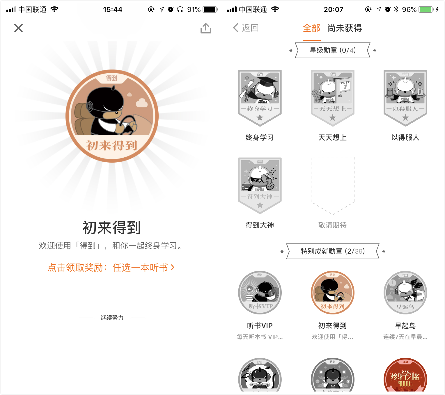 勋章功能(成就系统)以趣味的方式鼓励用户长期使用,同时能够激发用户的被记录、被认可心理。