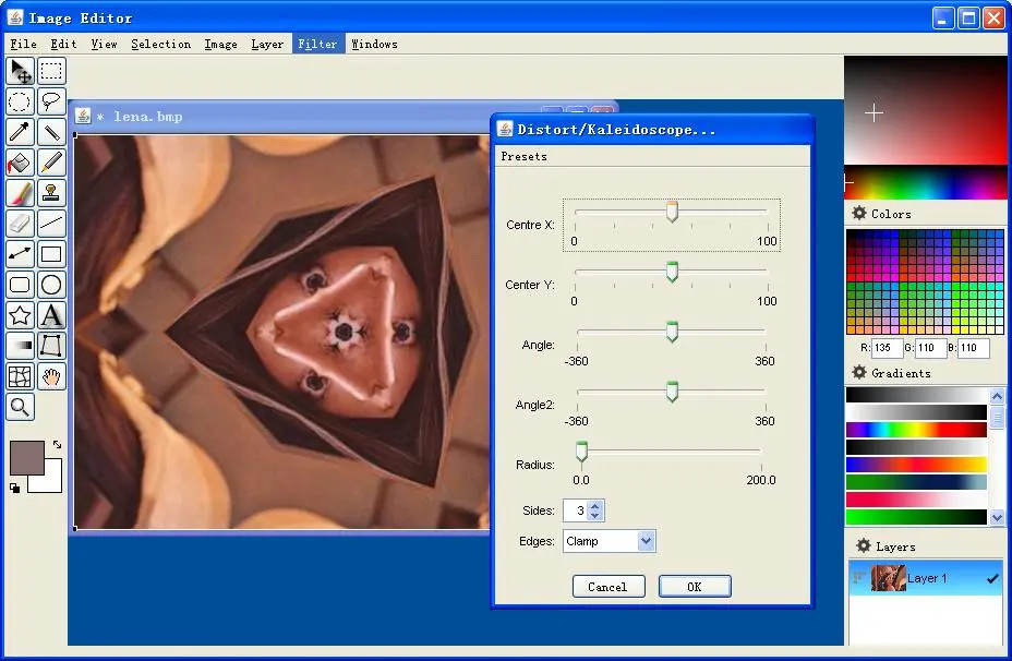 一个用JAVA开发的图像处理软件,具有图层、选区、滤镜以及其他一些工具。整体来说较上述两个软件稍次一些,但依旧强劲。提供了很多独特的滤镜算法,工具箱中的透视变形工具很给力,是用JAVA开发图像值得借鉴的好代码。算法的执行速度一般。