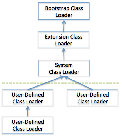 类加载器被组织成一种层级结构关系,也就是父子关系。其中,Bootstrap是所有类加载器的父亲。如下图所示:
