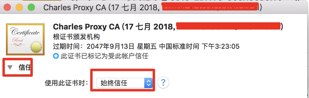 在证书界面搜索,charles,双击证书,手动设置为始终信任(列表界面,可能还是显示不信任,无影响,保存即可)