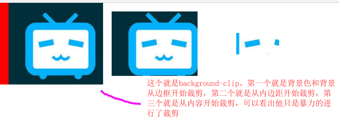 - 三个值分别是boder-box||padding-box||content-box,意思分别是从边框||内边距||内容开始裁剪!只是裁剪!暴力的给你裁剪!不是从哪里开始!