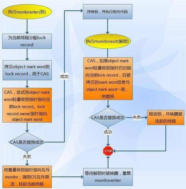 在代码进入同步块的时候,如果此同步对象没有被锁定(锁标志位为“01”状态),虚拟机首先将在当前线程的栈帧中建立一个名为锁记录(Lock Record)的空间,用于存储锁对象目前的Mark Word的拷贝(官方把这份拷贝加了一个Displaced前缀,即Displaced Mark Word)。然后,虚拟机将使用CAS操作尝试将对象的Mark Word更新为指向Lock Record的指针。如果这个更新动作成功,那么这个线程就拥有了该对象的锁,并且对象Mark Word的锁标志位(Mark Word的最后2bit)将转变为“00”,即表示此对象处于轻量级锁定状态。如果这个更新操作失败了,虚拟机首先会检查对象的Mark Word是否指向当前线程的栈帧,如果是说明当前线程已经拥有了这个对象的锁,那就可以直接进入同步块继续执行,否则说明这个锁对象已经被其他线程抢占了。如果有两条以上的线程争用同一个锁,那轻量级锁就不再有效,要膨胀为重量级锁,锁标志的状态值变为“10”,Mark Word中存储的就是指向重量级锁(互斥量)的指针,后面等待锁的线程也要进入阻塞状态。