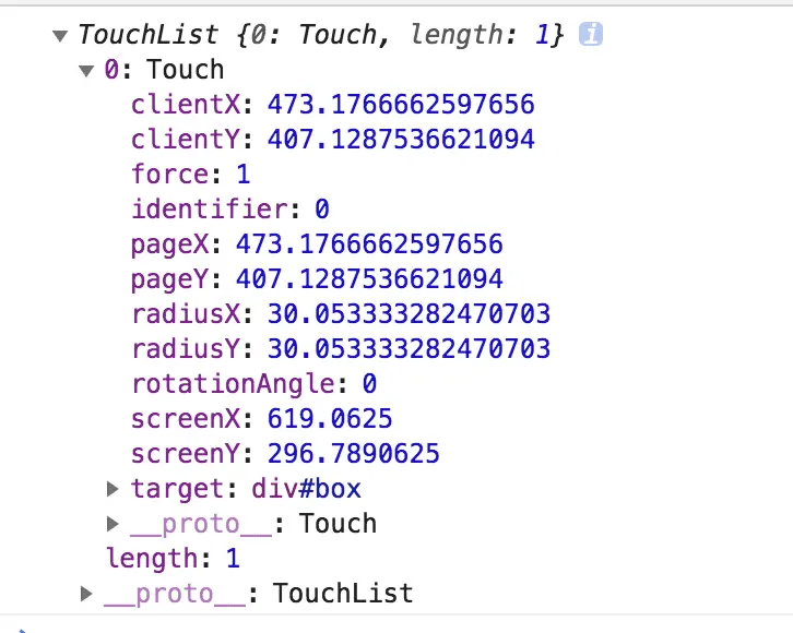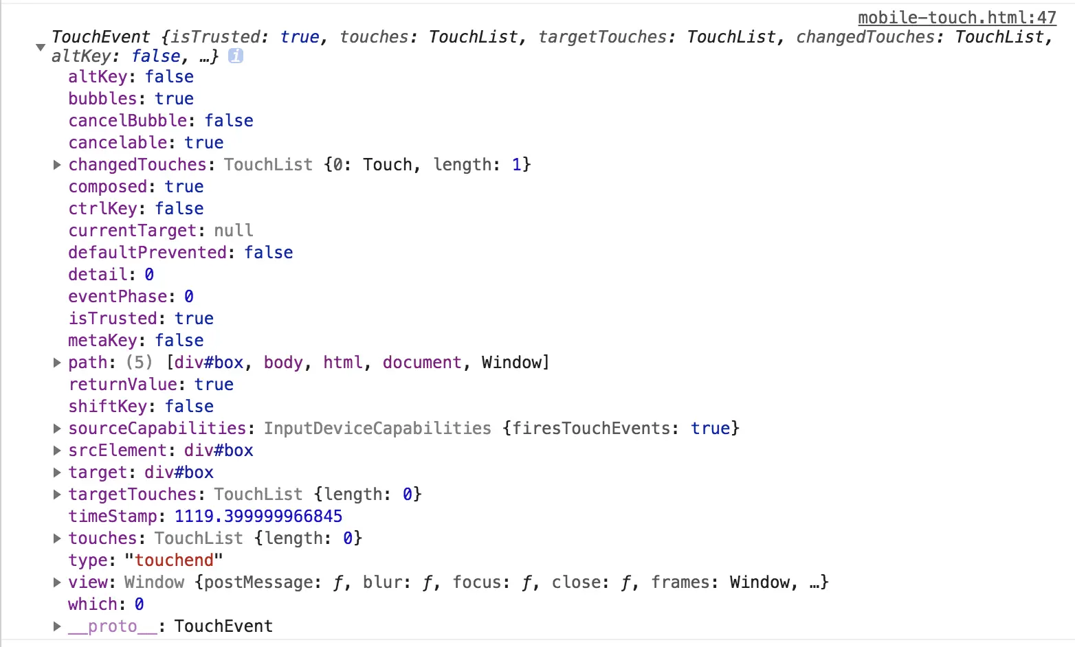 在touchend事件中,touches和targetTouches的长度都为0,因为触摸离开时,没有触摸点了,注意前面对touches、targetTouches和changeTouches的定义