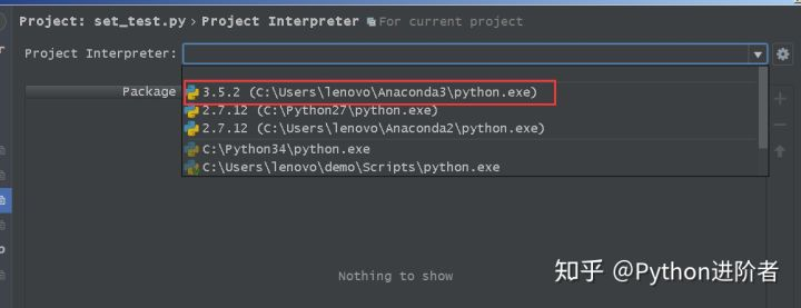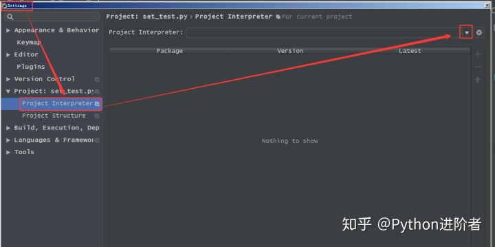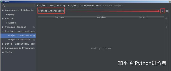 4、此时只需要点击“Project Interpreter”右侧的小三角下拉框,如下图右侧的红色小框框所示。