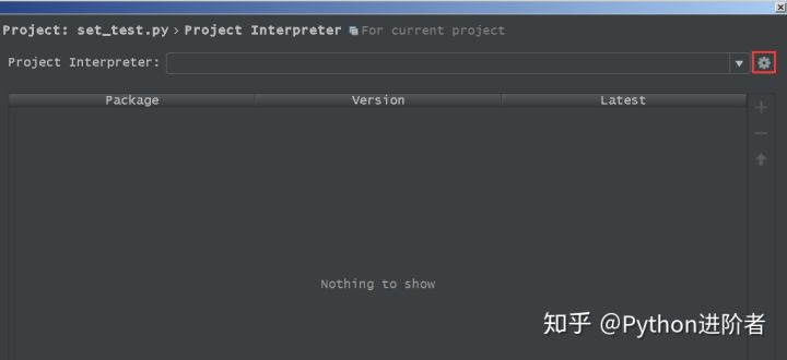 3、首先点击上图中“Configure Python Interpreter”,之后Pycharm就会自动定位到“Project Interpreter”这个位置,如下图所示,该界面是Pycharm的设置窗口之一,专门用于配置Python解释器的。