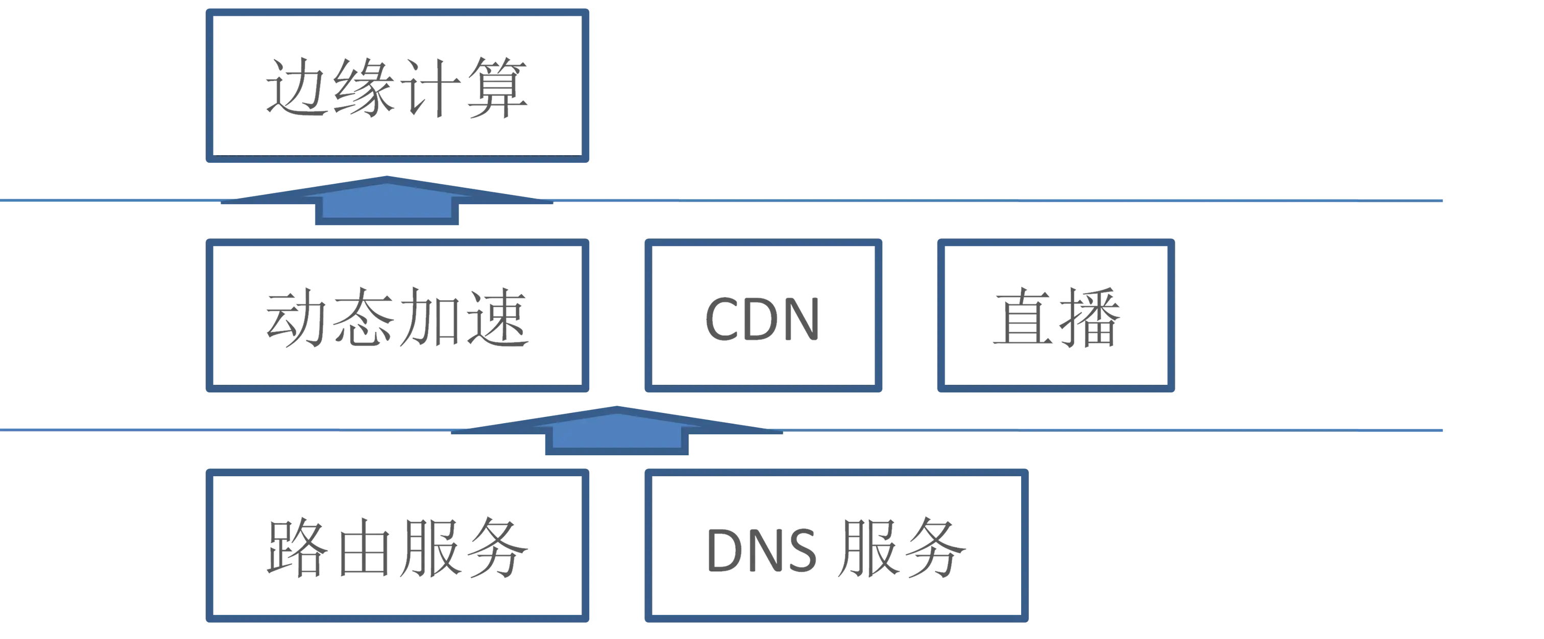 从上至下,边缘计算平台由分布在各个城市、运营商的节点组成,节点间物理网络可以互通。如果需要在网络进一步优化,则依赖动态加速网络,而动态加速网络的实现除了加速服务器本身以外,还需要路由服务、DNS服务来提供路由和域名解析等数据。另外,路由和DNS也为CDN、直播平台提供基础服务。